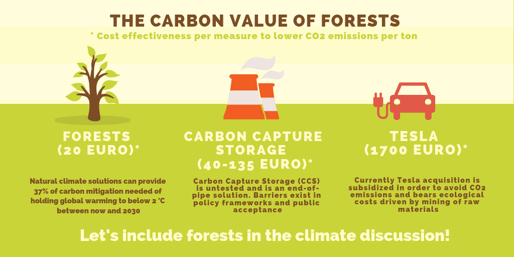 Dat is vreemd, want het voorkomen van degradatie of conversie van natuurlijk bos is de meest kosten-efficiënte manier om de opwarming van de aarde tegen te gaan. Deze natuurlijke klimaatoplossing kan 37% van de benodigde emissiereductie leveren in de periode 2020-2030[1], tegen een prijs van ongeveer 20 euro per ton CO2-e.[2]. Bovendien leveren bossystemen gratis diensten voor de bevolking, zoals schoon water, overstromingsbuffers, gezonde bodems, leefgebieden voor dieren, en klimaatverkoeling, die op hun beurt duurzame ontwikkeling op lokaal niveau veiligstellen. Ter vergelijking, de Nederlandse fiscus zal voor Carbon Capture Storage (CCS) 40 tot 135 euro per ton CO2 vermeden uitstoot moeten uittrekken en subsidieert nu al iedere verkochte Tesla met fiscale maatregelen ter waarde van 1700 euro per ton CO2 vermeden uitstoot [3. Deze interventies brengen sociale lasten en milieulasten met zich mee, negatieve externaliteiten, zoals een verminderde waarde van woningen in CO2 opslaggebieden en verlies aan biodiversiteit door mijnbouw in tropische gebieden.